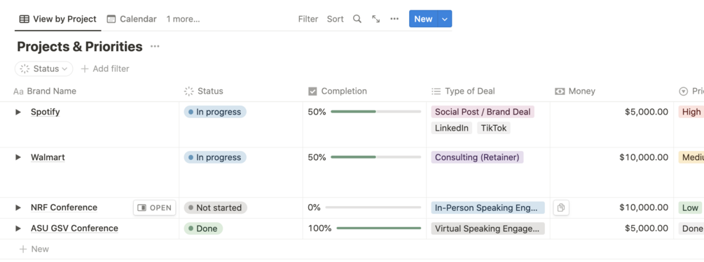This template is perfect for creators who are full-time and managing several types of projects/income (consulting, public speaking, sponsored social posts, etc.). Same with solopreneurs with several side hustles they're trying to keep track of.
